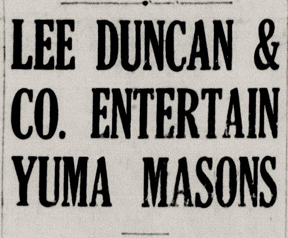 On February 24, 1927 Lee Duncan, accompanied by his German Shepherds, Rin Tin Tin and Nanette, was a guest of the Yuma Masons. After Lee Duncan recounted the story of his rescue of Rin Tin Tin from a World War I battlefield, the Masons were treated to a half hour of Rin Tin Tin’s “tricks and stunts.”